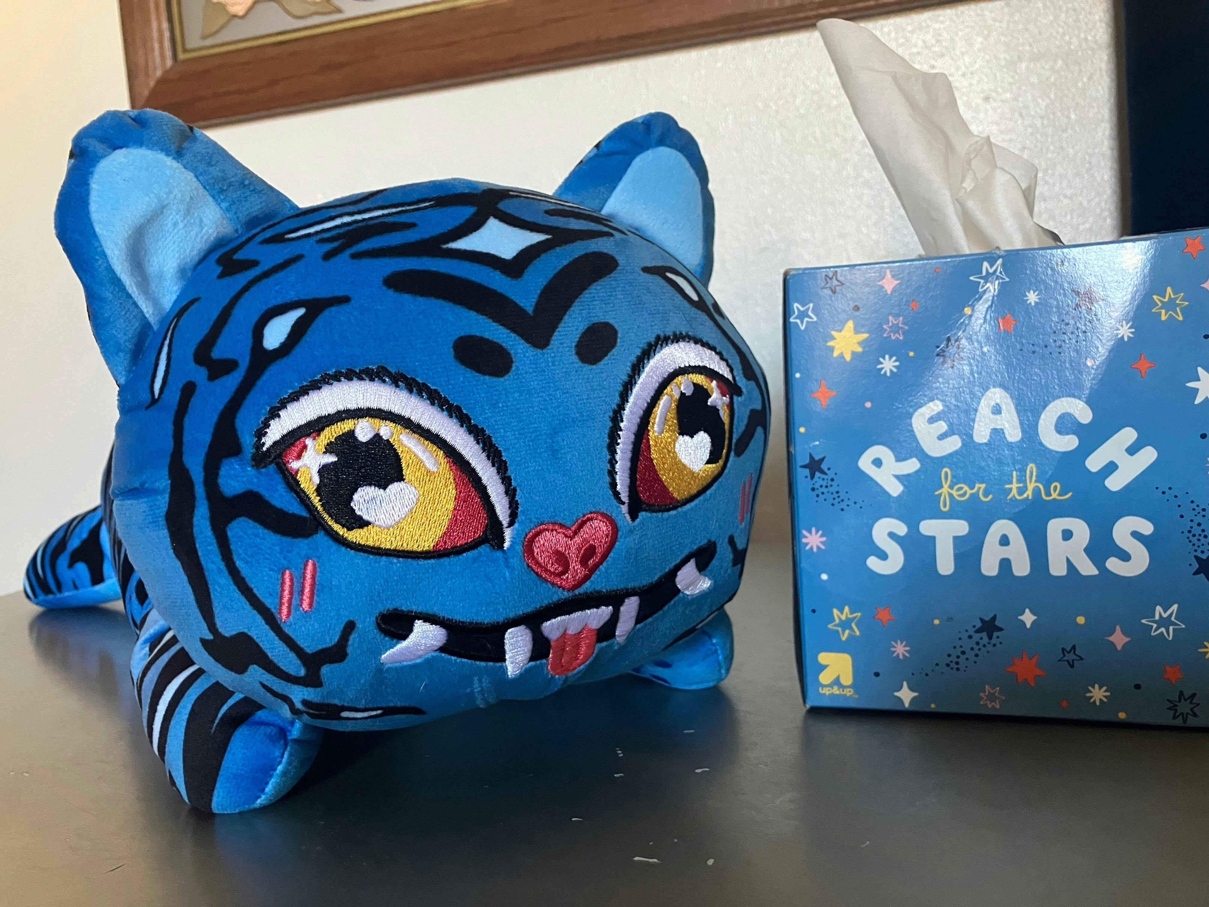 I can’t believe how gorgeous this tiger is. The design is stunning. The embroidered face and paw pads are so well done and such great quality. The fur is velvety soft. And he’s huge!! I’ve been looking for a nice Derpy to snuggle, and I kept finding very small ones which aren’t good for snuggling. This guy is huge and heavy and perfect for snuggling. I am still in awe of how perfect he is. I’m so grateful for this shop for making the best plushie ever! I included photos with a Kleenex box to show how big he is.